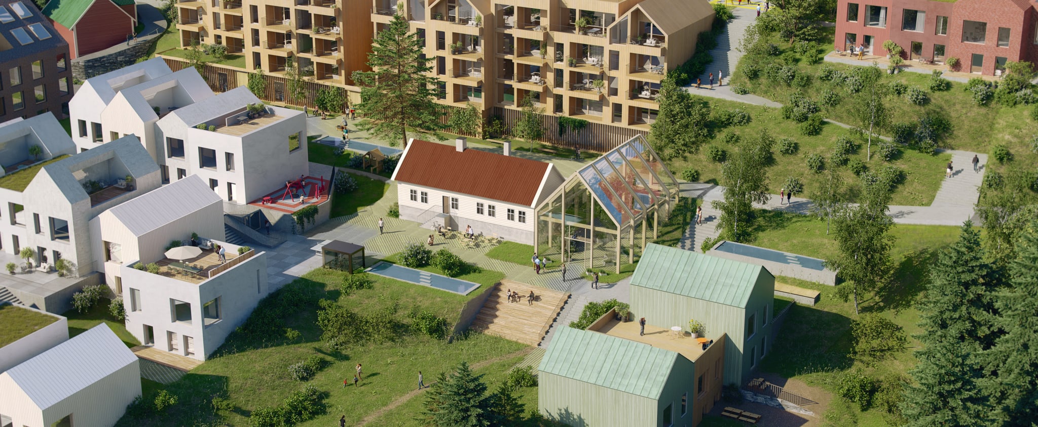 I utkanten av nabolaget planlegges en egen barnehage, slik at småbarnsfamilier får en lettstelt hverdag uten lange transportetapper. I tillegg skal det oppføres et stort drivhus — et grønt møtested for fellesskap, sosiale samlinger, planteglede og rekreasjon. Som en hyggelig gest mot områdets historie, skal det gamle gårdshuset og låven i Dolvik gjøres om til felleslokaler for beboerne, og være en arena for sosiale sammenkomster, nabotreff eller bare et sted å møtes over en kopp kaffe. I utkanten av nabolaget er det planlagt ballbinge, slik at også de større barna skal ha et sted å være.