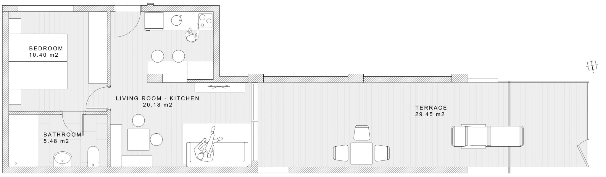Corner apartment with a large terrace and direct access from terrace to the sundeck and pool.