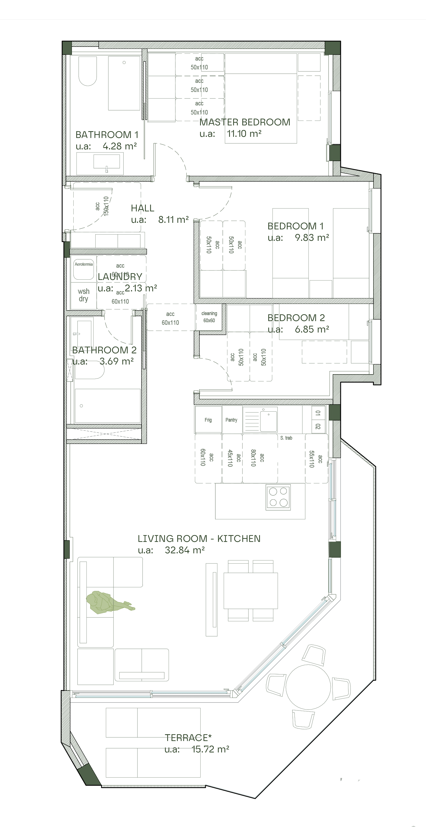 This apartment features a hallway with wardrobe space, three bedrooms, and two bathrooms – both with a shower, toilet, and sink, and a separate laundry-room. The master bedroom includes its own en-suite bathroom. The open-plan kitchen and living room offer ample space for both a dining area and a sofa set. Large sliding doors provide direct access to a private terrace of approximately 16 m².