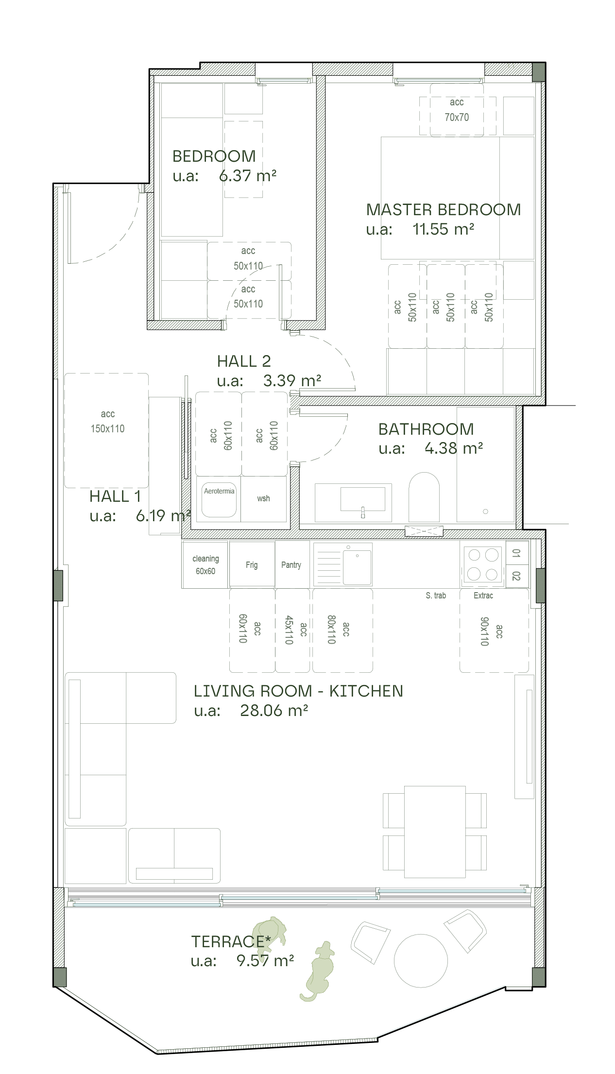 The apartment features a hallway with wardrobe space, two bedrooms, and a bathroom with a shower, toilet and sink. The open-plan kitchen and living room offer ample space for both a dining area and a sofa set. Large sliding doors provide direct access to a private terrace of approximately 10 m².