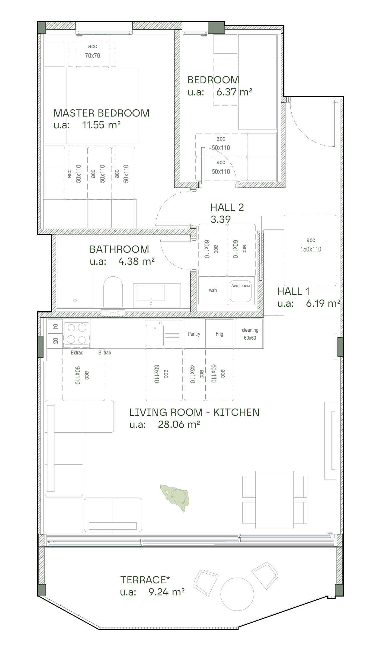 The apartment features a hallway with wardrobe space, two bedrooms, and a bathroom with a shower, toilet and sink. The open-plan kitchen and living room offer ample space for both a dining area and a sofa set. Large sliding doors provide direct access to a private terrace of approximately 9 m².
