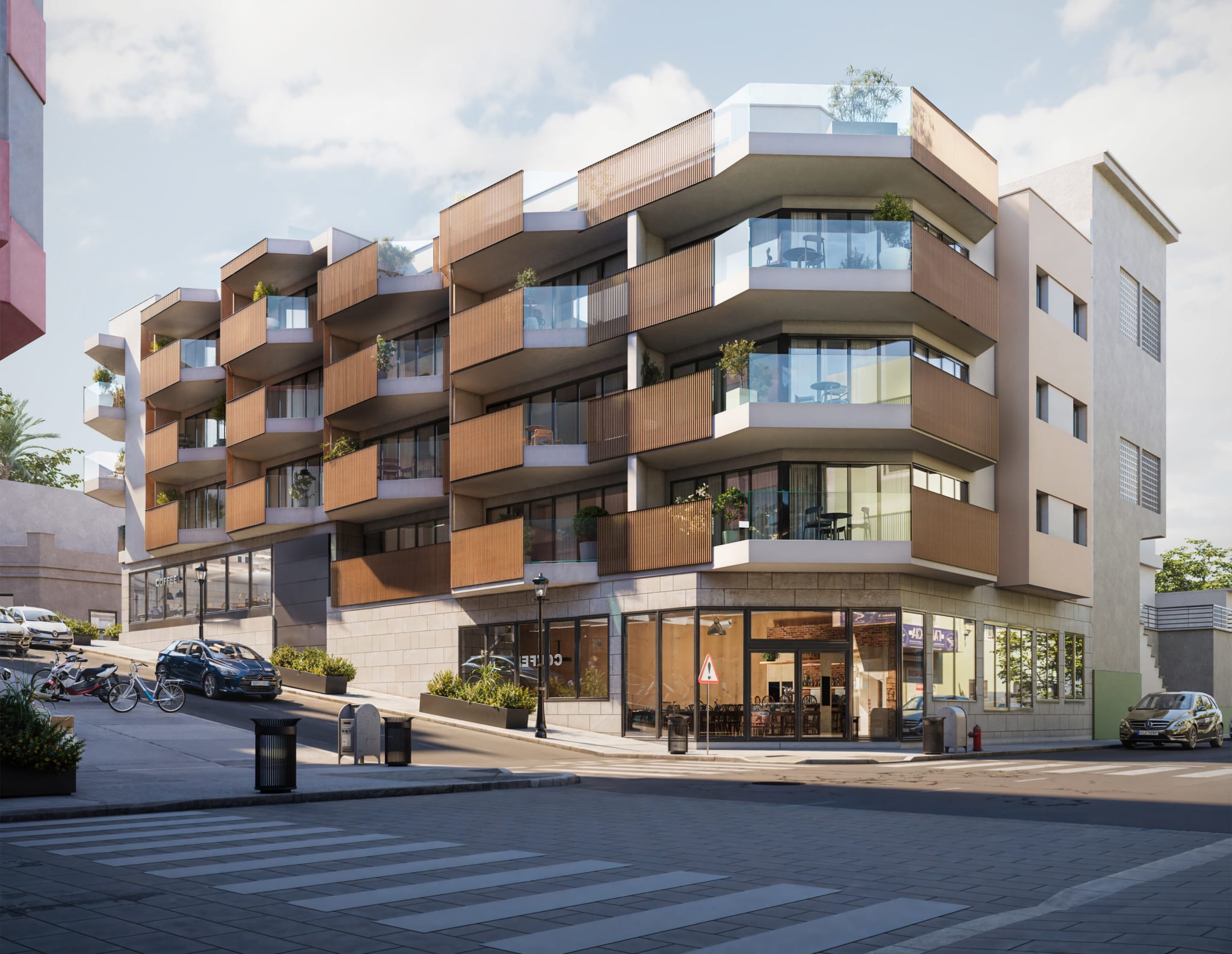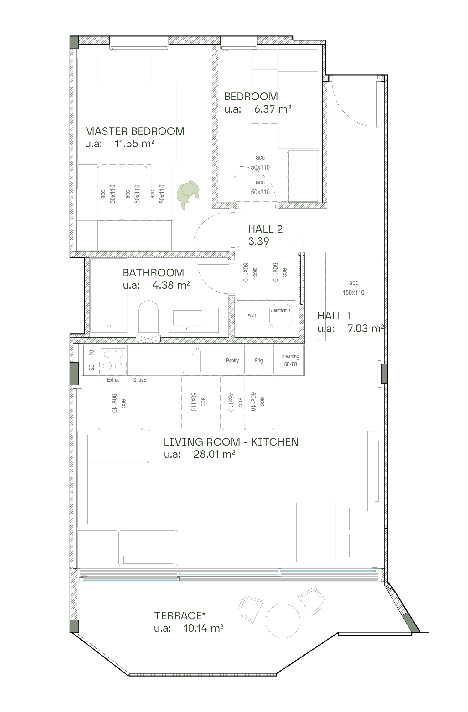 The apartment features a hallway with wardrobe space, two bedrooms, and a bathroom with a shower, toilet and sink. The open-plan kitchen and living room offer ample space for both a dining area and a sofa set. Large sliding doors provide direct access to a private terrace of approximately 10 m².