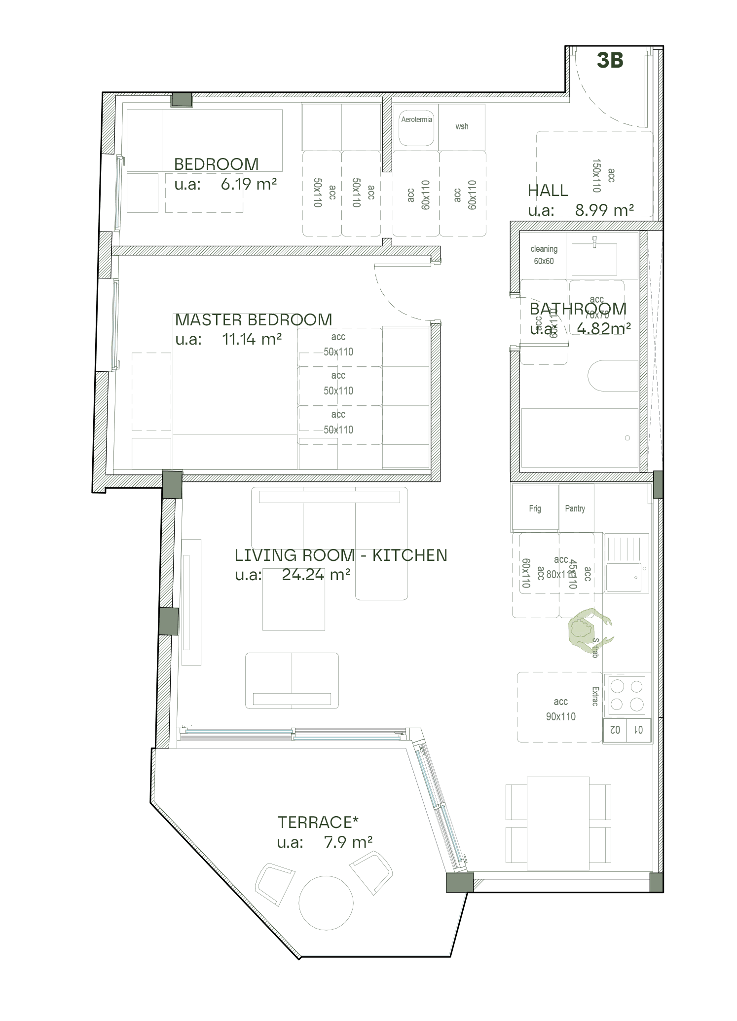 The apartment features a hallway with wardrobe space, two bedrooms, and a bathroom with a shower, toilet and sink. The open-plan kitchen and living room offer ample space for both a dining area and a sofa set. Large sliding doors provide direct access to a private terrace of approximately 8 m².