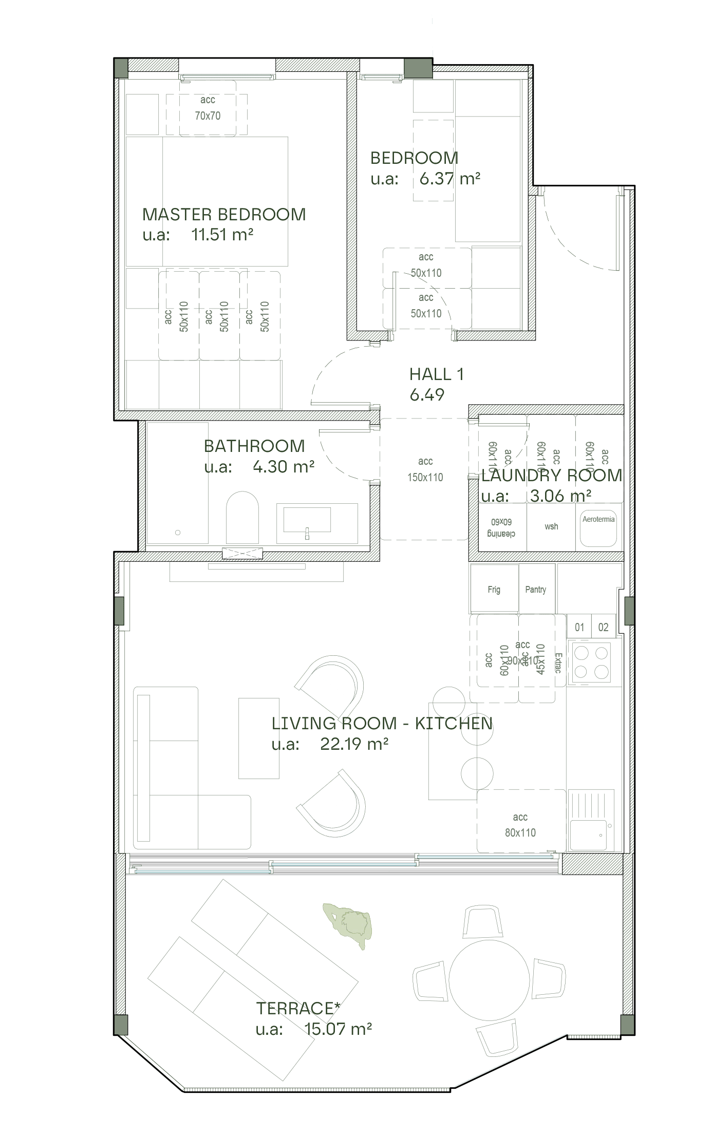 The apartment features a hallway with wardrobe space, two bedrooms, and a bathroom with a shower, toilet and sink. The open-plan kitchen and living room offer ample space for both a dining area and a sofa set. Large sliding doors provide direct access to a private terrace of approximately 15 m².