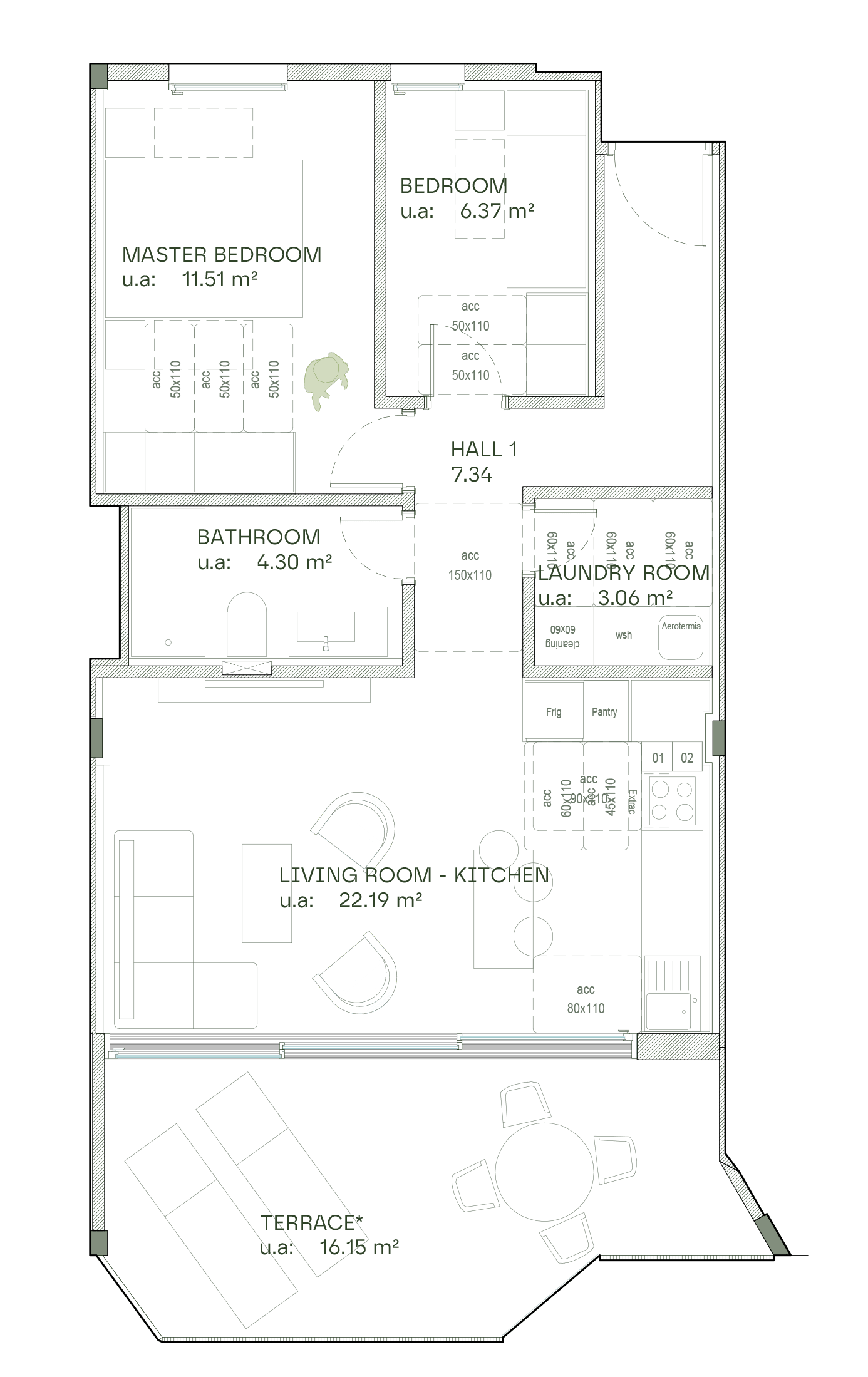 The apartment features a hallway with wardrobe space, two bedrooms, and a bathroom with a shower, toilet and sink. The open-plan kitchen and living room offer ample space for both a dining area and a sofa set. Large sliding doors provide direct access to a private terrace of approximately 16 m².