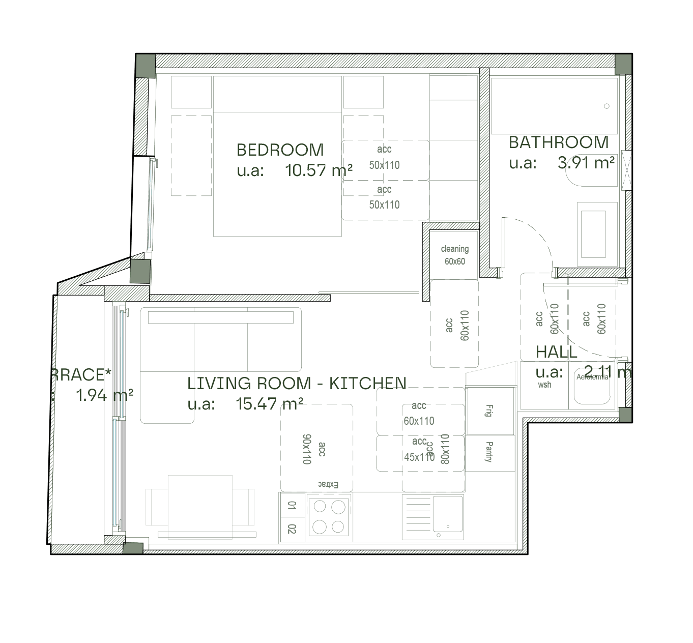 The apartment features a hallway, a large bedroom, and a bathroom with a shower, toilet and sink. The open-plan kitchen and living room offer space for both a dining area and a sofa set. Large sliding doors provide direct access to a private terrace of approximately 2 m².