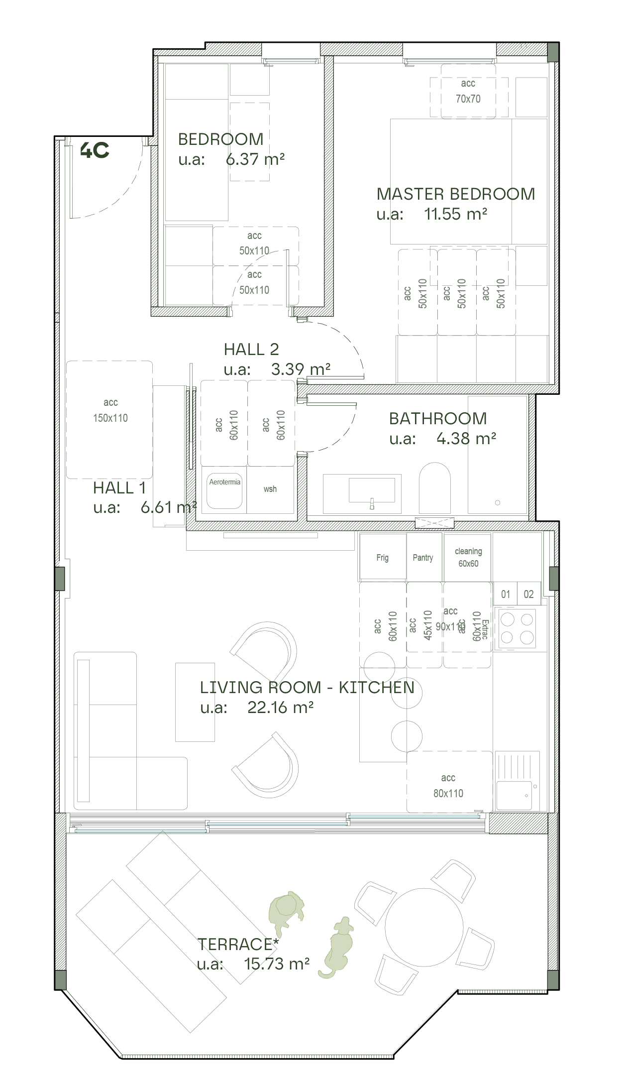 The apartment features a hallway with wardrobe space, two bedrooms, and a bathroom with a shower, toilet and sink. The open-plan kitchen and living room offer ample space for both a dining area and a sofa set. Large sliding doors provide direct access to a private terrace of approximately 16 m².