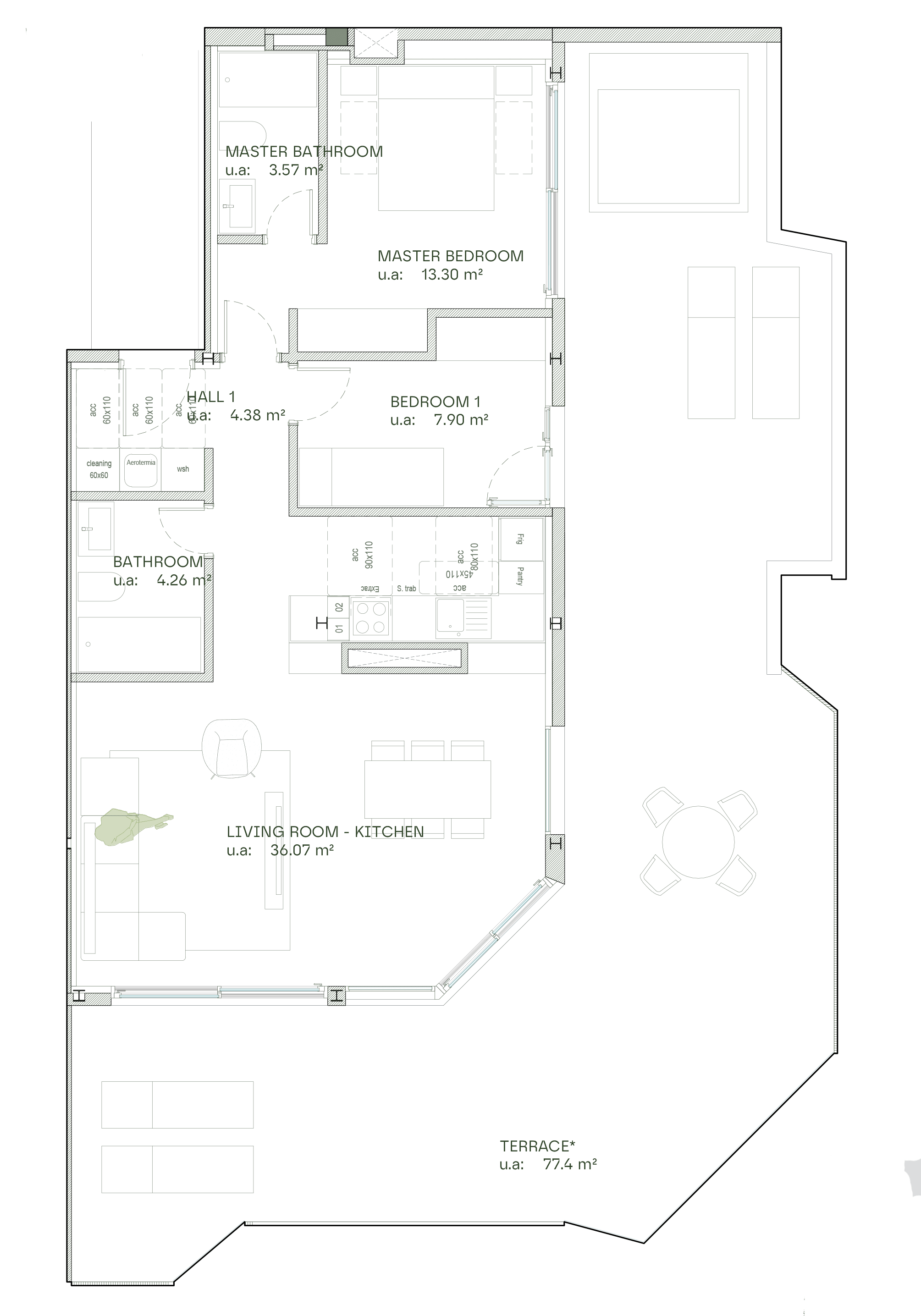 This corner-unit features a practical layout and offers a panoramic view. The apartment includes a hallway with wardrobe space, two bedrooms, and two bathrooms – both with a shower, toilet, and sink. The master bedroom has its own en-suite bathroom. The open-plan kitchen and living room provide ample space for both a dining area and a sofa set. Large sliding doors lead to a large and private terrace of approximately 77 m², perfect for enjoying the amazing outdoor-space.