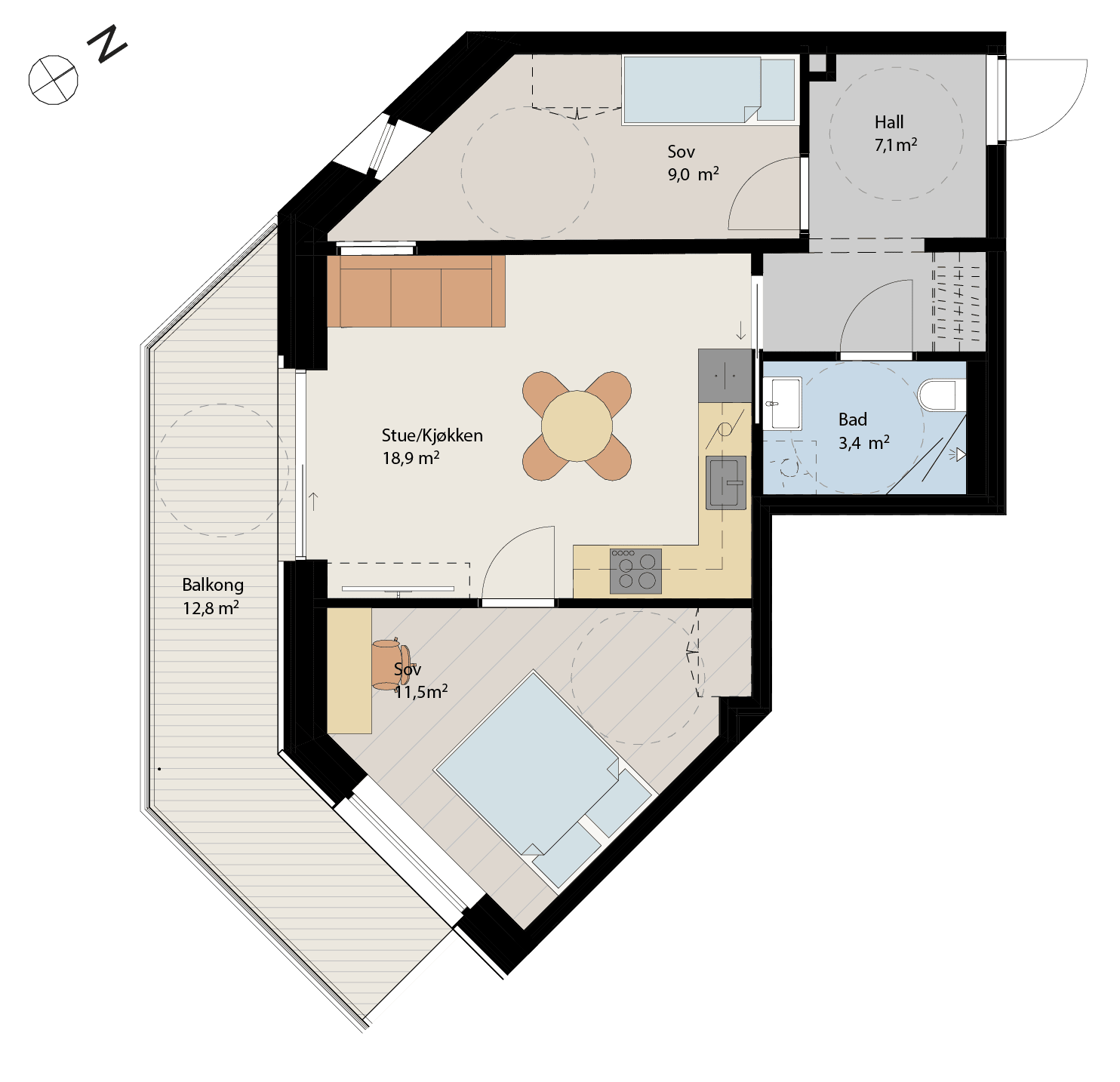 Effektiv og innholdsrik leilighet med god takhøyde og spennende løsninger.