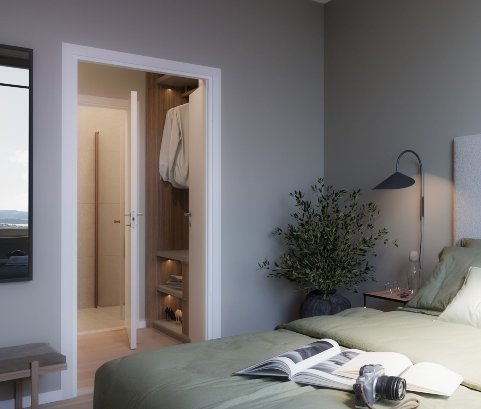 Flere av leilighetene har både in-suite bad og walk-in garderobe i tilknytning til soverommet. En behagelig start på dagen – og et sted å trekke seg tilbake når kvelden kommer. Unn deg hotellfølelsen i hverdagen. Din egen plass, uten forstyrrelser.