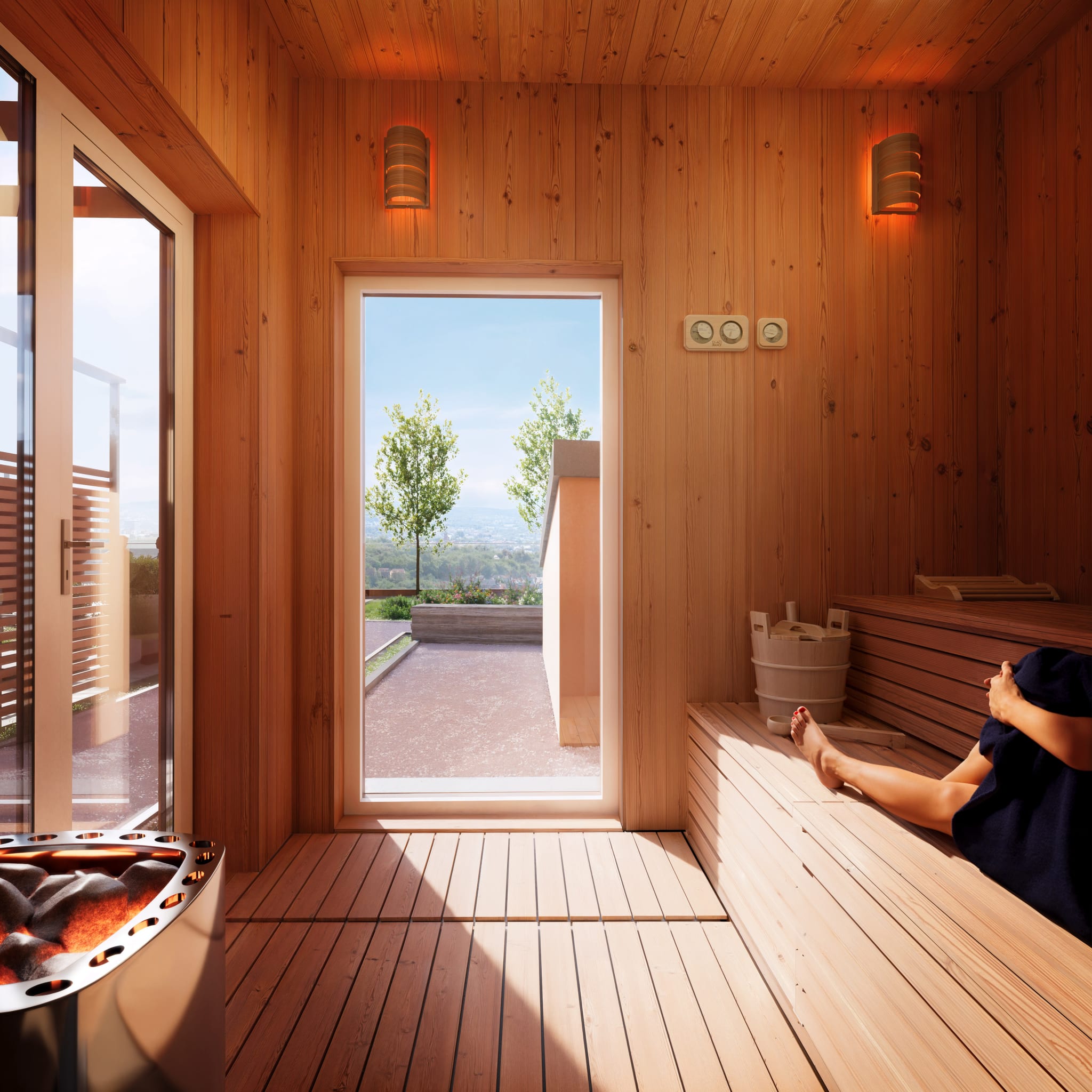 På takterrassen finnes en felles badstue – et tilbud for dem som setter pris på ro og avkobling i hverdagen. Den milde varmen kan bidra til å redusere stress og gir en følelse av velvære. Fra badstuen er det fantastisk utsikt mot Oslo. Unn deg selv en pause, alene eller sammen med andre.