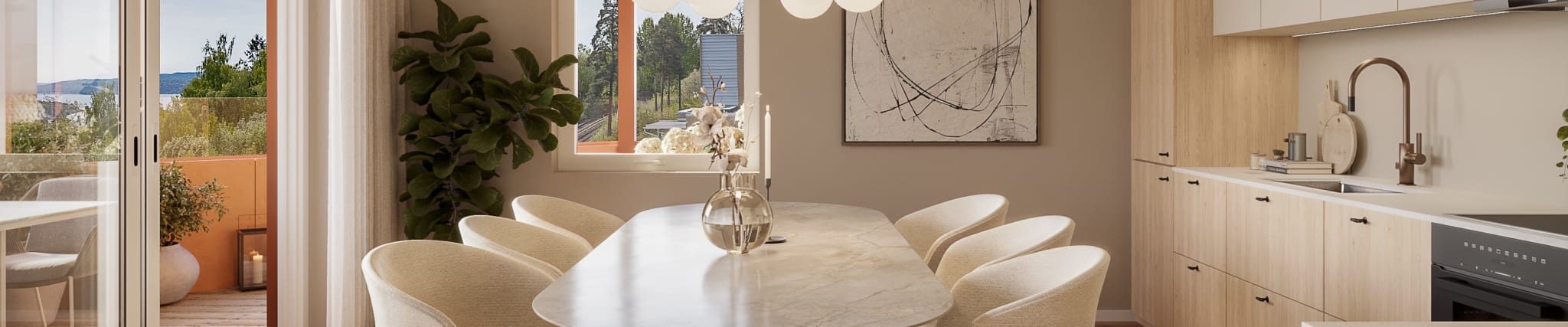 Et gjennomarbeidet og eksklusivt designkonsept ligger til grunn for valg av farger og materialer til hver leilighet. Paletten balanserer det nordiske og moderne, med det klassiske og varme.