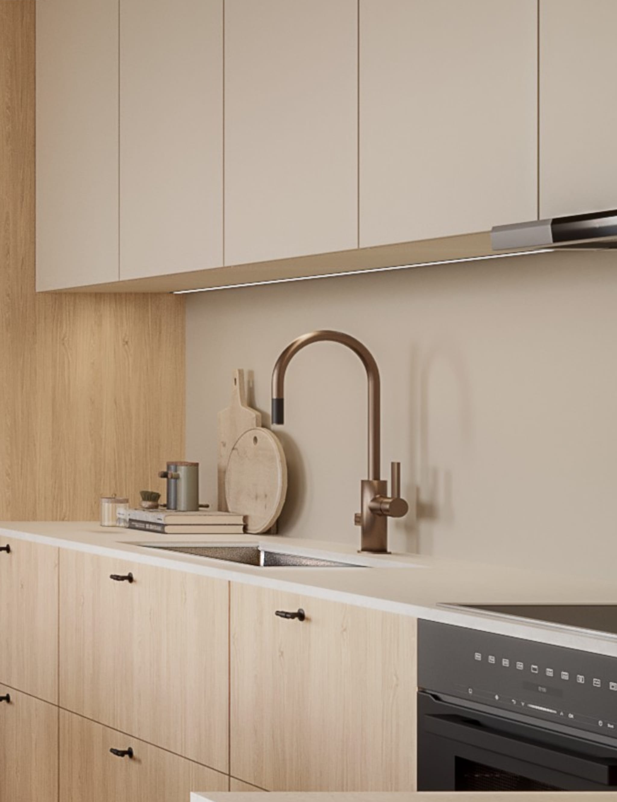 Det er de små detaljene som løfter helheten. På kjøkkenet leveres underlimt vask, en slitesterk komposittbenkeplate og integrert ventilator fra Røroshetta. Håndtak på underskapene er valgt i brunet messing, som gir et diskret og gjennomført uttrykk, godt tilpasset kjøkkenets øvrige farger og materialer.