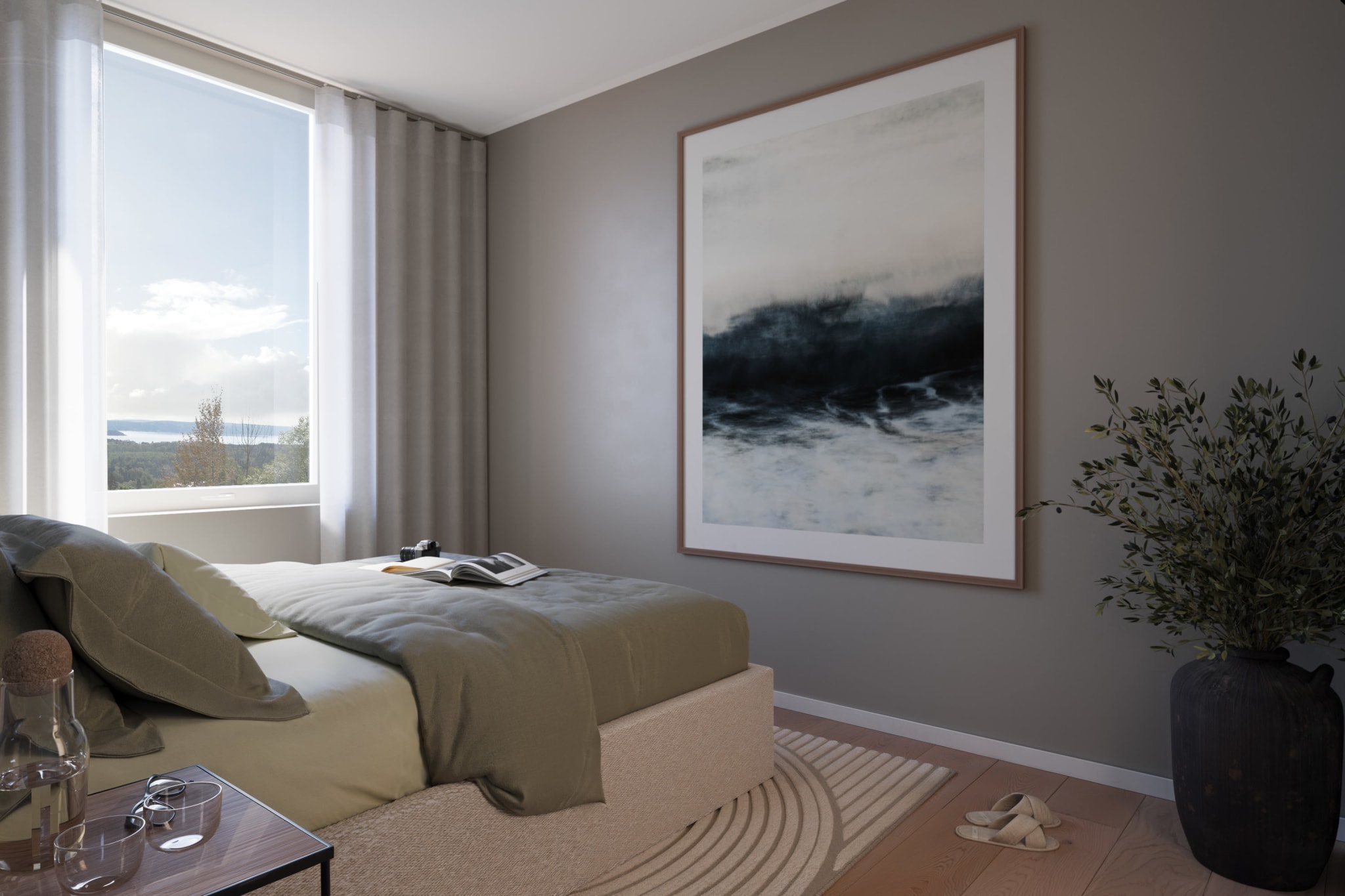 For å skape en lun og avslappende atmosfære, er soverommene malt i en balansert og varm gråtone, Varmgrå – en nyanse som er akkurat ett hakk dypere enn fargene som brukes i øvrige oppholdsrom. En subtil kontrast som bevarer en helhet gjennom hele leiligheten, samtidig som det gir en behagelig følelse på soverommene.