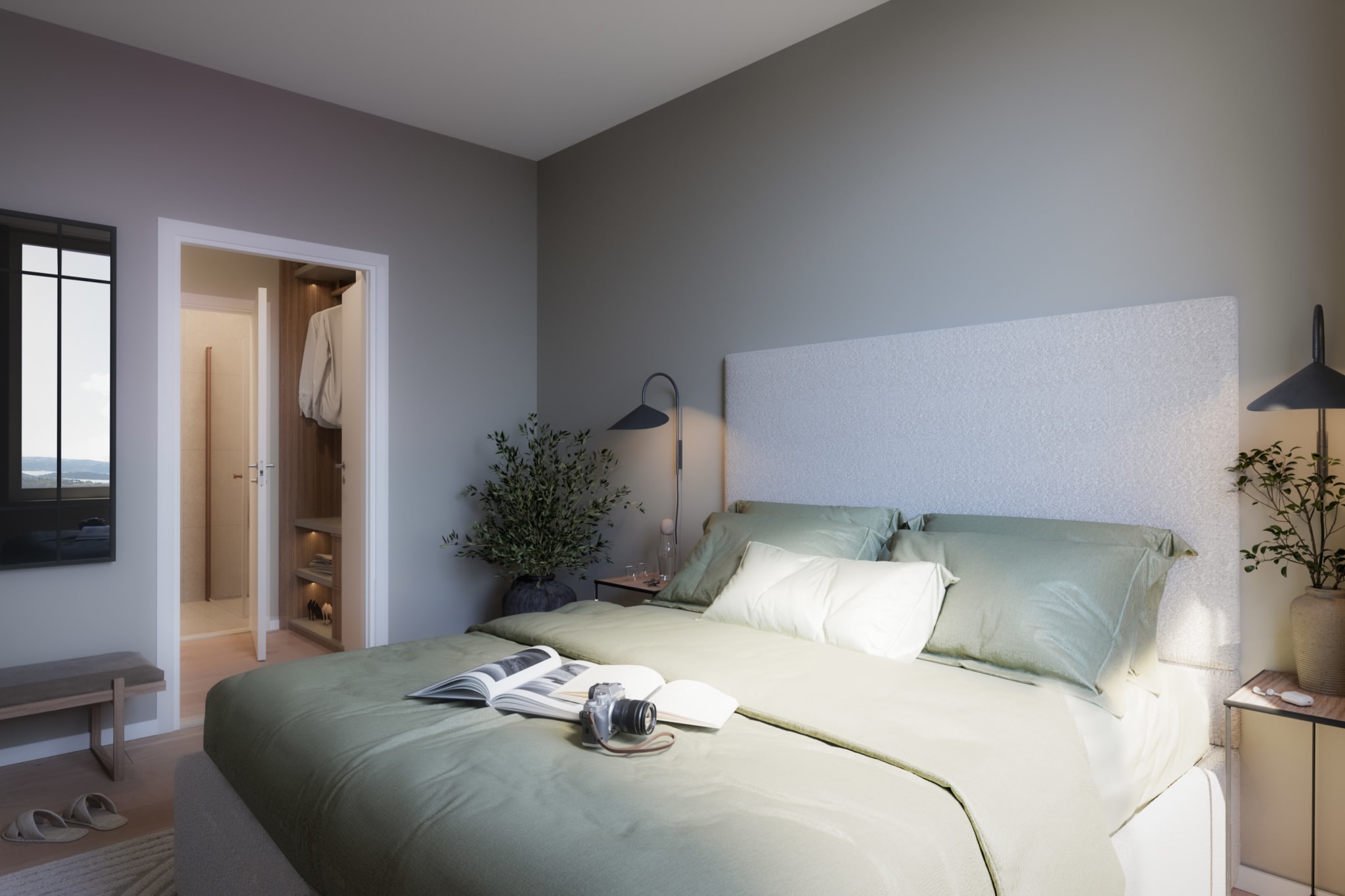 I de større leilighetene er det lagt vekt på tydelige, private soner – med soverom, in-suite bad og walk-in garderobe samlet og avskjermet fra oppholdsarealene. Flere boliger har også en mellomstue eller kontorplass i tilknytning til hovedsoverommet, som gir ekstra rom til det som måtte passe deg. Veggene er malt i den lune nyansen Varmgrå – en dempet kontrast til resten av boligen som skaper ro og balanse. Et soverom som innbyr til hvile, og gir plass til å lande – helt for deg selv.